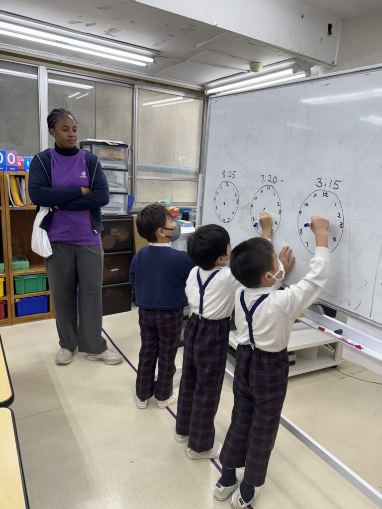 今日は時計のよみかたの復習しました。英語でパッと時計をよむのは、意外と難しいのです。でもホワイトボードでみんなで復習してから、ワークシートに取り組むと、みんな驚くほどよくできていました!