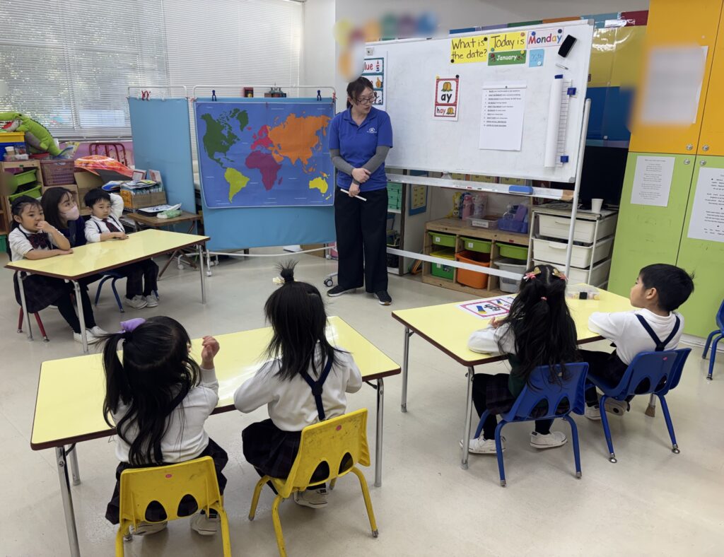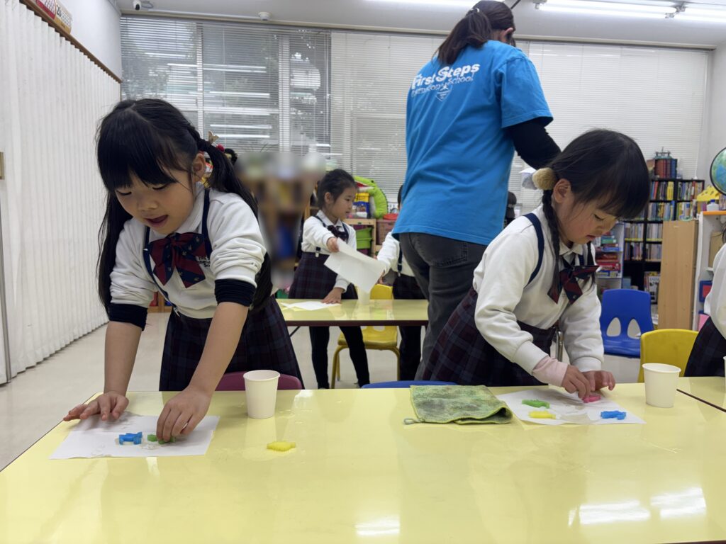Scienceではplanetsについてまとめたもの読み上げた後、新たに恐竜について学び始めました。「首が長い、高い木の葉を食べる恐竜は?」など恐竜クイズも楽しみました。学ぶ前から子どもたちが恐竜の名前を多く知っていて驚きました。興味関心を持ってこれからも学んでいって欲しいですね。ぬるま湯にカプセルを入れると恐竜が生まれるというactivityを行いました。とてもワクワクした様子で目を輝かせていた子どもたち。カプセルが溶けて恐竜が出てくると嬉しそうにしていましたよ。