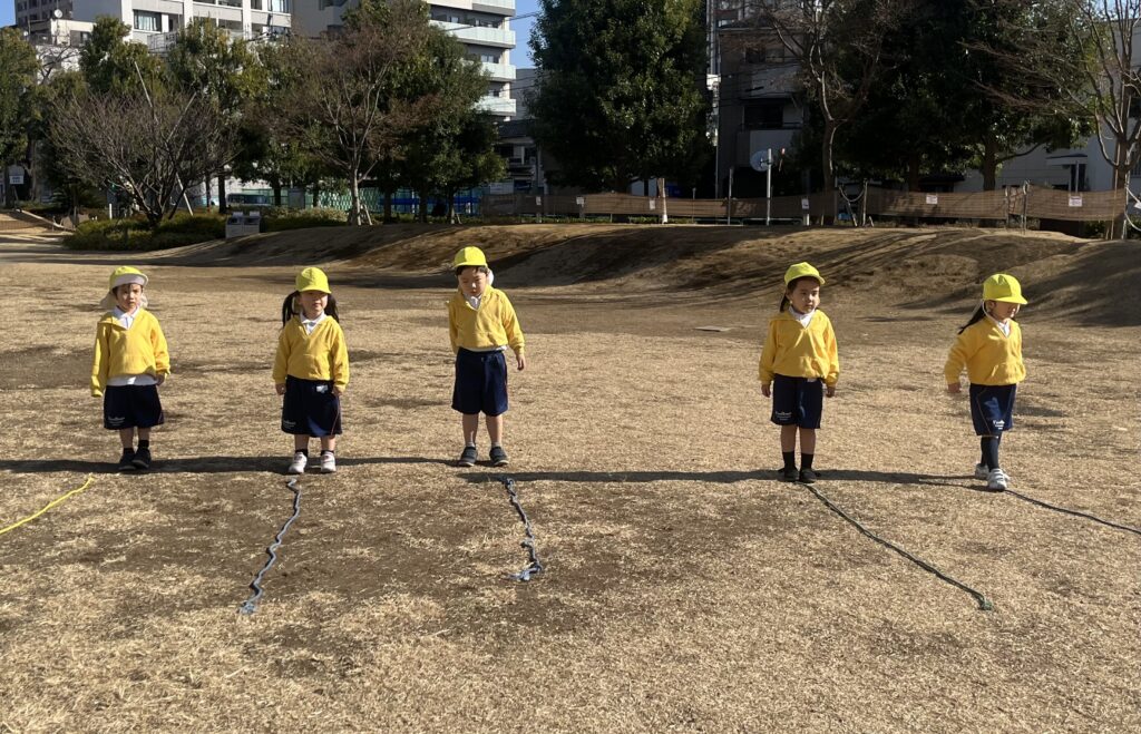 k1クラスは今日から縄跳びの練習を始めました。今日はまずは縄跳びの縄に慣れる為に地面に置いた縄跳びの上を右左交互に跳んだり縄跳びの上を歩いたりしました。又、縄跳びを片付けるときに縄跳びを結ぶ練習をしました。縄を結ぶことは難しいですがみんな一生懸命挑戦していました。