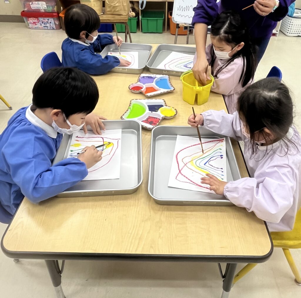 今日はparkに遊びに行きました。KIクラスと一緒にボール遊びを最初に行いました。2チームに分かれて後ろのお友だちにボールを渡すゲームをしました。下からパスをするときは「under」と言いながら足の間を通してパスをし、上からパスをするときは「over」と言いながら頭の上からパスをしました。協力しながらせかせかとボールをパスする様子が可愛かったです。自由遊びの時間もたくさん体を動かし、笑顔も多く見られましたよ。
