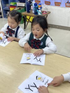 k1クラスはlettersの授業でletter「Y」を学びました。letter「Y」bookに書かれているYam,Yolkなどのwordsを「What’s this?」と興味津々で先生に尋ねていました。又、l …
