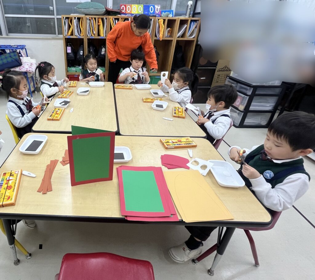 今日のartの授業ではクリスマスカードをハサミやクレヨンを使って製作しました。このクリスマスカードは完成したらみんなでポストに投函しに行く予定であることを伝えると驚いたりお友達と顔を見合わせて嬉しそうな表情をしていました。今日はクリスマスカードの表紙の部分を作り、中身はまた後日作る予定です。