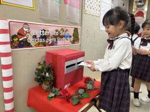 今日は以前サンタさんに宛てて書いた手紙をエントランスにあるポストに投函しました。朝の時間にどんなプレゼントをお願いしたのかみんなで話し、盛り上がっていましたよ。一生懸命書いた子どもたちの手紙がサンタさんに届きますように。 …