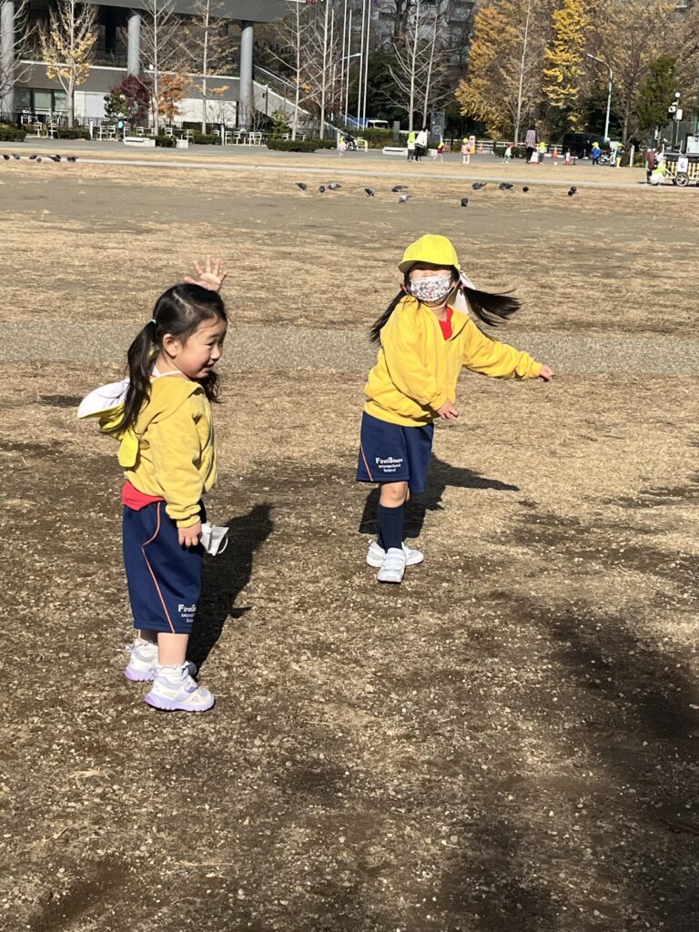 今日はいけさんパークに行って遊びました。自由遊びでは、丘を何度も登り降りして遊んだり、お友達と葉っぱや小石を見つけてケーキやサラダ作りをしたり、フープで遊んだりしていました。自由遊びの後はプリスクールみんなでドッヂボールをしました。先生が投げるボールに当たらないようにみんなキャーキャーいいながらボールを避けてスリルを楽しんでいました。