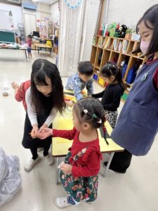 今日は新聞紙や画用紙、白いゴミ袋、様々な種類のテープなどの材料をあらかじめ用意して、k1〜k3混合の3つのグループに分かれてsnowman作りをしました。用意された材料でどのようにそしてどのようなsnowmanを作るのか …